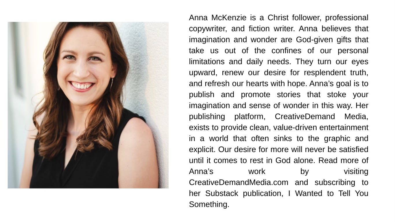 I’m a Christ follower, professional copywriter, and storyteller. I’ve always been passionate about writing fiction, and my goal is to provide value-driven entertainment for people who love books and stories as much as I do. My current project is a book of modern fairytales that I’ve been publishing here on Substack — it focuses on a young maiden narrator who has offended an evil leprechaun. She’s cursed to wander the woods and wastes of fairyland until a stranger says her name, and the story is about all the people (and creatures) she meets over the course of her journey. I’ve also been working on a sci-fi novel trilogy that is set in futuristic Los Angeles, where some people have discovered that they have the power of telekinesis. The main character, a young female nurse, finds herself right in the middle of a conflict between two telekinetic factions — and its outcome may have global implications. I have a few more ideas in the hopper too... so many books to write, so little time! Right now they are all in the fantasy and sci-fi genre.