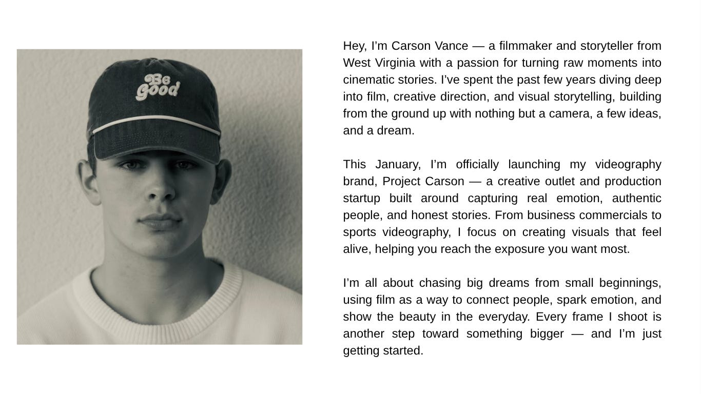 Hello, I’m Carson Vance, a 20-year-old from Sissonville, located just outside Charleston, West Virginia. From a young age, I developed a deep interest in cinema, often using my father’s old camera to capture scenes around my hometown. Following a series of sports-related injuries, I transitioned into filmmaking, which has since become my primary passion and career focus.