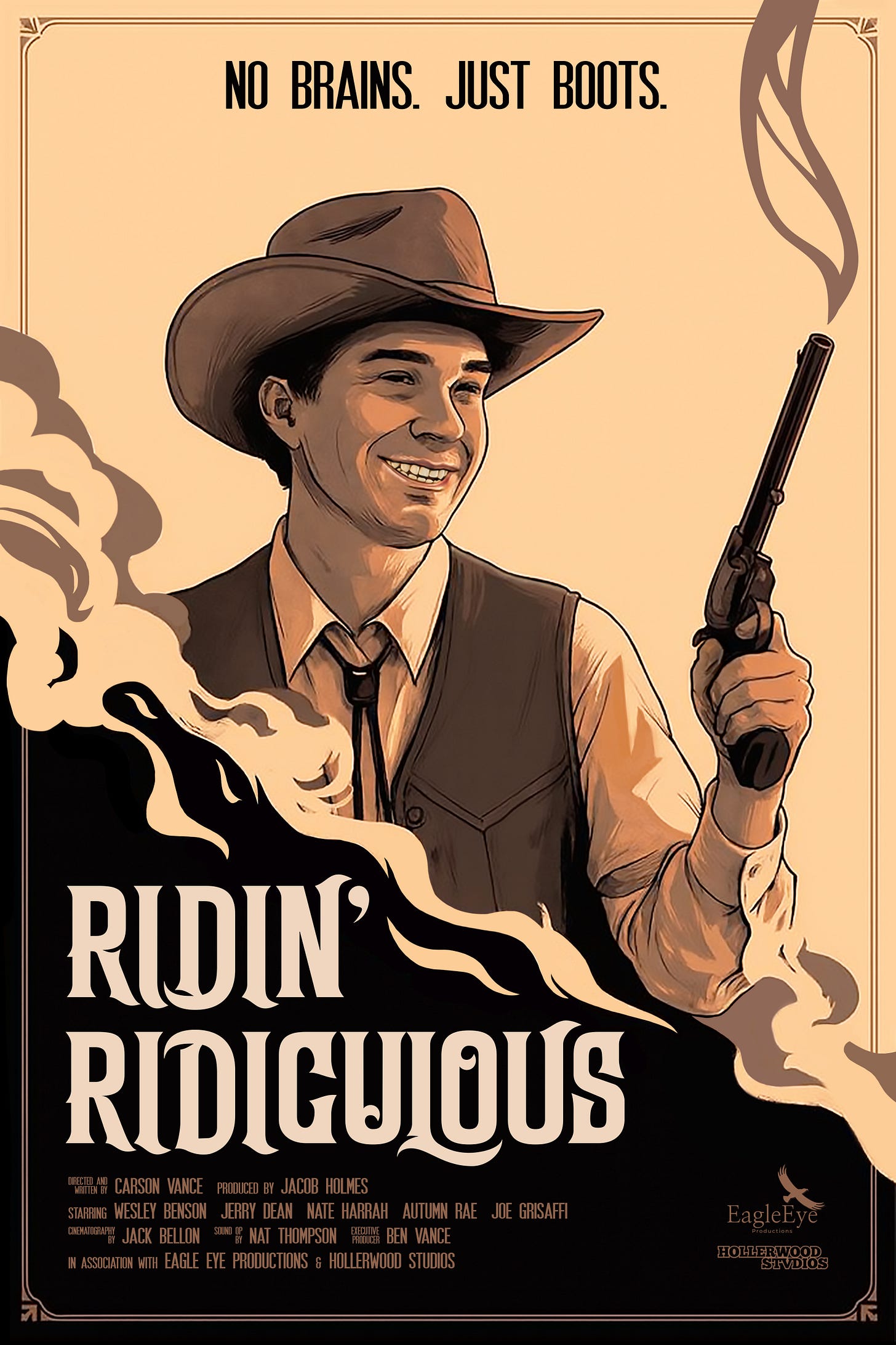 Ridin’ Ridiculous’ actually came to me during my senior year of high school in the middle of math class, of all places. I was doodling this little daydream of myself on a Hollywood set, directing some big production, when the idea flipped in my head. Instead of the classic Wild West, I pictured this awkward, offbeat gunslinger trying to make his way through the backwoods of Appalachia. It turned into this story about small-town folks pushing through life’s setbacks with grit, humor, and heart. At its core, it’s about chasing big dreams from small beginnings. I ended up completely zoning out of class and started outlining the script right there in my notebook. It’s got a lot of my West Virginia roots in it. Those little quirks that make small towns feel both unique and universal.