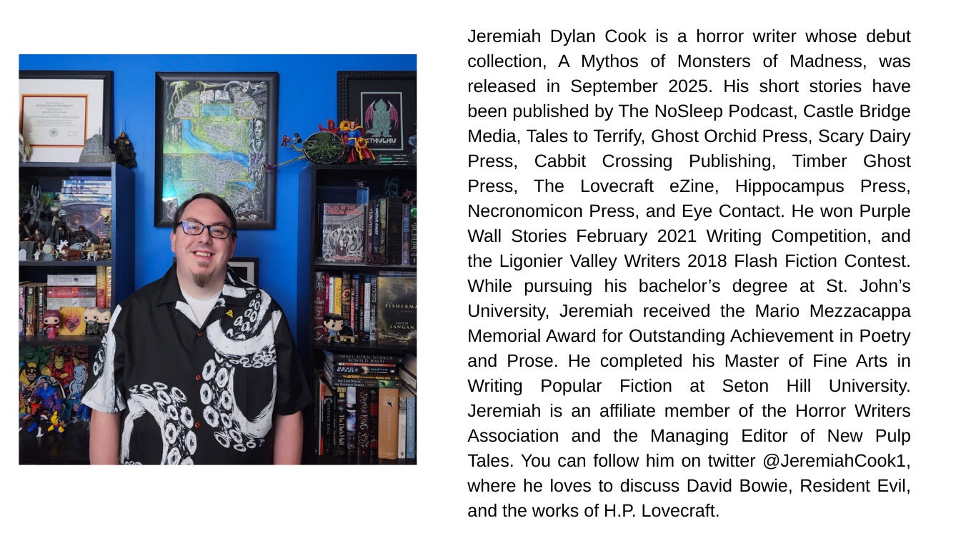 A Mythos of Monsters and Madness felt like the natural next step after I had a good foundation of short stories published. I was partially inspired by short story collections like The Wide Carnivorous Sky by John Langan and Occultation by Laird Barron, but I also wanted to be able to get a copy of my book in my mother’s hands before she passed away, and I have been increasingly worried about her health since she had a major stroke in 2022. There are also a few other elderly family members and friends who I worried might not make it to see my book come out if I didn’t publish in 2025. Maybe it sounds weird, but I wanted them to know the encouragement and help they provided me paid off.