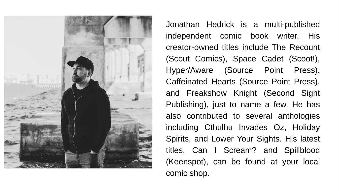 1. “Hospice” is a shared comic book universe on Kickstarter. There was a series of successful campaigns back in 2023 that were all one-shot, self-contained stories with a single common thread; the “Rising Suns Hospice” which is an evil place people go to crossover near the end of life. My story is set in this shared universe but there’s no required reading to understand and enjoy it.