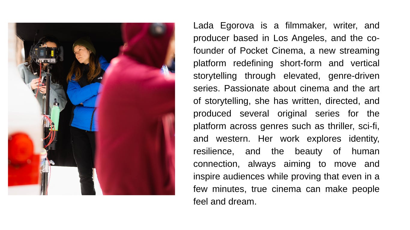 I’m a Russian-French writer, director and producer based in Los Angeles. I have written and directed a dozen short films, my latest one was selected in a screenwriting residency in France and got a film production grant. I also created 2 TV pilots, one got picked up for distribution. This year I have written, directed and coproduced 3 full series, and I am currently in preproduction of three new series for the short series app Pocket Cinema I cofounded, a platform for genre-driven vertical series (but we also do horizontal traditional series) with a focus on elevated storytelling and the support of rising filmmakers. The app will release end of 2025. My latest detective-noir series The Price of Yesterday will be shooting end of this month.
