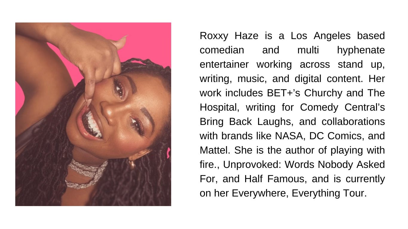 People can find me at roxxyhaze.com for tour dates, projects, and updates. All of my books, playing with fire., Unprovoked: Words Nobody Asked For, and Half Famous, are also available on Amazon. I’m active across social platforms as Roxxy Haze, where I share stand up clips, writing, music, and whatever chaotic creative thing I’m working on at the moment.